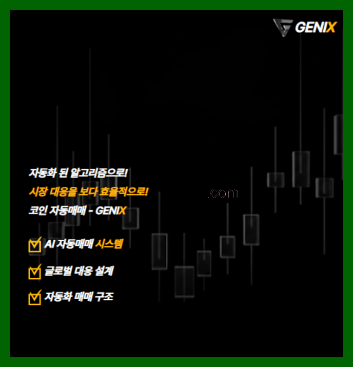 GENIX 트레이딩 시스템 GENIX는 기존 알봇 ALBOT을 전면 리뉴얼하여 탄생한 AI 기반 코인 업비트 플랫폼입니다. GENIX 트레이딩 시스템는 안정적인 수익을 내는 것을 목표로 하고 있으며, 현재 글로벌 코인 업비트 솔루션으로 운영중입니다.