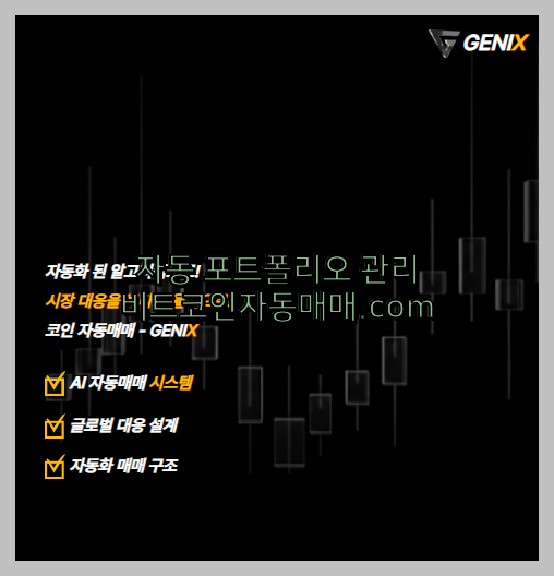 GENIX 트레이딩 봇 GENIX는 자동매매 시스템 기존 알봇 ALBOT을 전면 리뉴얼하여 탄생한 AI 기반 코인 자동매매 플랫폼입니다. GENIX 트레이딩 봇는 안정적인 수익을 내는 것을 목표로 하고 있으며, 현재 글로벌 코인 자동매매 솔루션으로 운영중입니다.